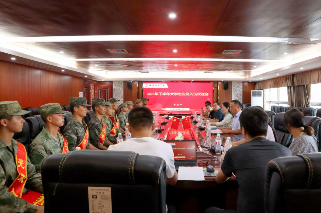热血踏上新征程,同心共筑强军梦。9 月 14 日下午,402永利集团在行政楼三楼会议室召开了 2024 年下半年大学生应征入伍欢送会,校武装部长董俊、副部长周华、国防教育科副科长梁峻豪、武装专干曾超、入伍新兵相关学院党总支副书记、征兵专干及全体入伍新兵参加欢送会,会议由周华主持。