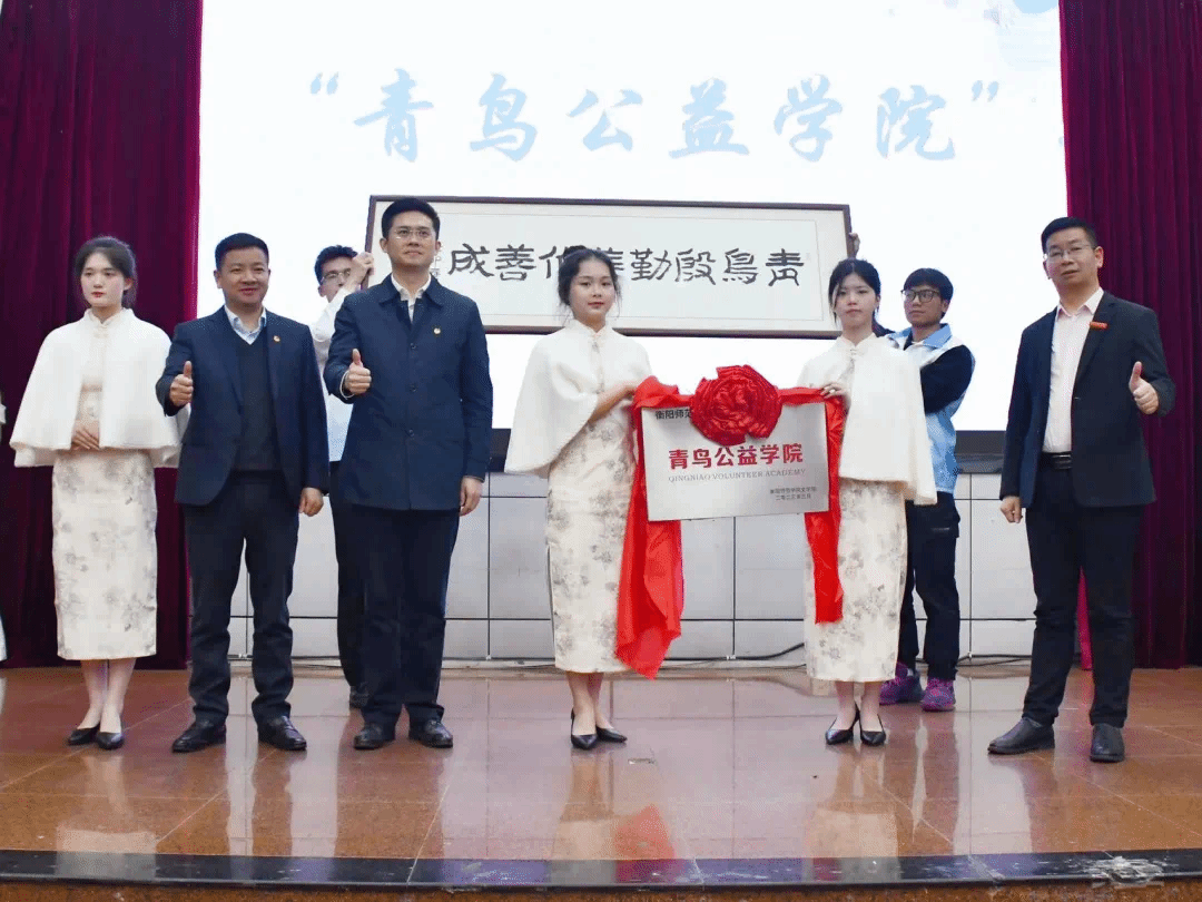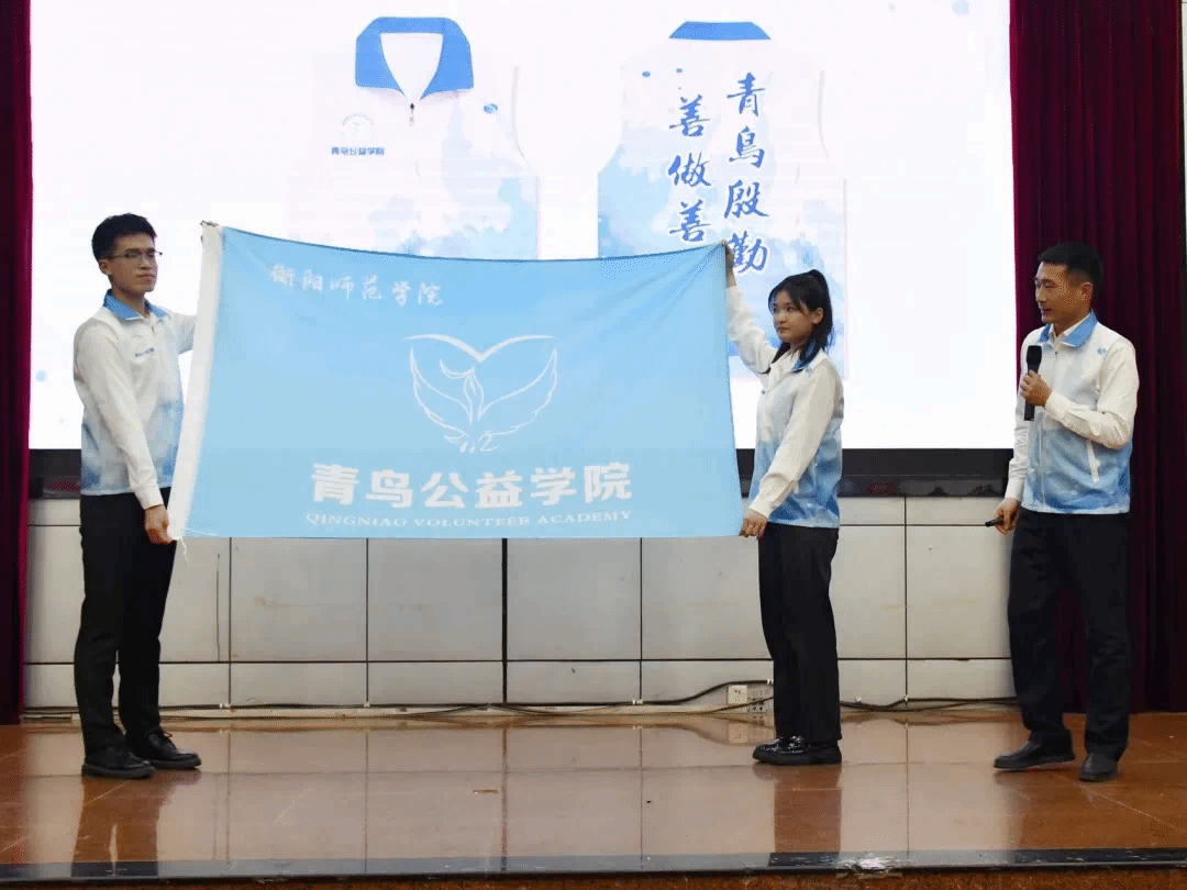 接着,共青团衡阳市委员会书记王致伟、共青团402永利集团委员会书记朱贤友和文学院党总支书记张云峰为“青鸟公益学院”揭牌,并向唐备战、童罗、陈亮伟三位导师颁发第一批青鸟公益学院公益导师的聘书。颁发完毕后,共青团衡阳市委书记王致伟致辞,分享他对于公益的看法——公益无大小,同时也对青鸟公益学院提出了期望。