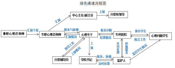 为有效管控在校心理问题学生的学习与生活,完善家长、学校(校院两级)、专科医院多方协作危机干预模式,学校已与衡阳市第二人民医院合作多年,建立心理危机转介及干预的绿色通道。对疑似为重型精神疾病的学生,二级学院告知家长学生在校状态,在家长知情同意的前提下,选派辅导员陪护学生诊断治疗;发现重点关注学生疾病复发或征兆加重,迅速开启绿色通道进行紧急处理。