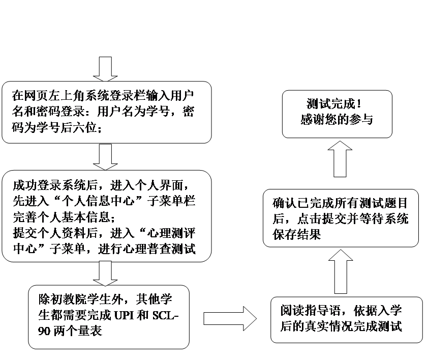 各学院要向学生说明心理健康测评的目的、意义及测试要求,要求学生积极配合严格按照规定程序和要求操作,以保证心理测评工作有序进行和圆满完成。