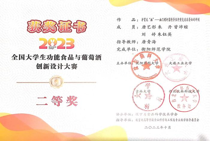 4、全国大学生功能食品与葡萄酒创新设计大赛国家级二等奖