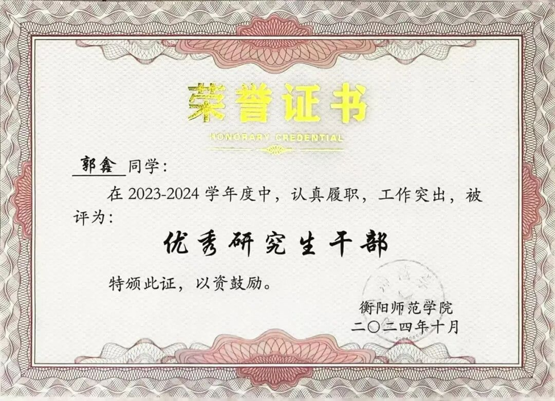 在学术研究的道路上,郭鑫同学始终保持严谨认真的态度。她珍惜每一次与老师探讨交流的机会,课堂上积极思考,课后主动查阅资料、深入研究。她以扎实的专业知识和创新的思维,在教育管理领域不断探索,最终在《内蒙古师范大学学报(教育科学版)》发表论文,并在湖南省教师教育专业委员会的论坛中取得优异成绩。这些成果的背后,是她无数个日夜的付出与坚持,也彰显了她在学术研究方面的深厚功底和卓越能力。