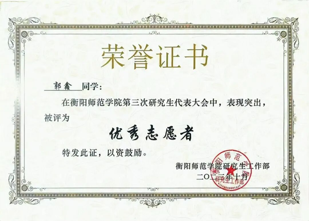 1.2023年荣获402永利集团第三次研究生代表大会“优秀志愿者”称号
