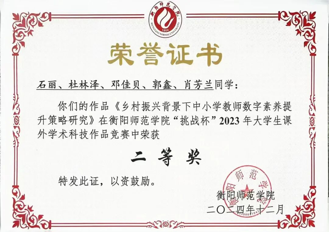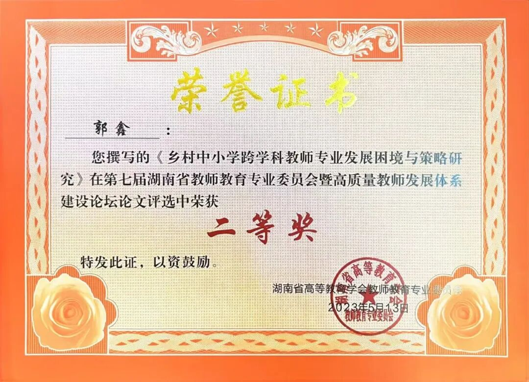 1.2023年荣获第七届湖南省教师教育专业委员会暨高质量教师发展体系建设论坛评选二等奖