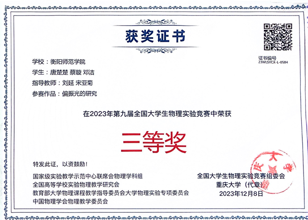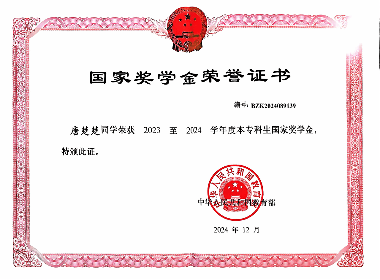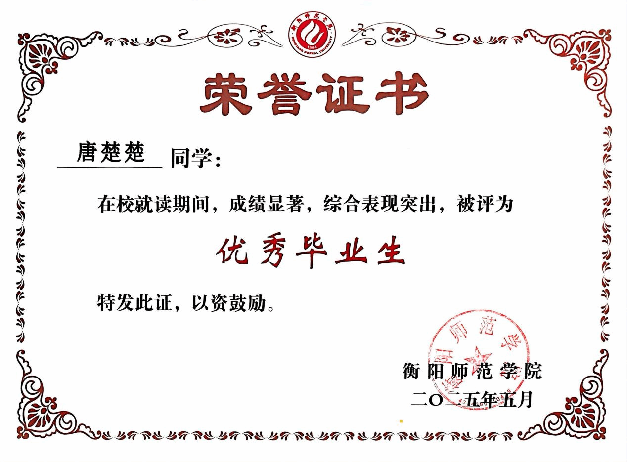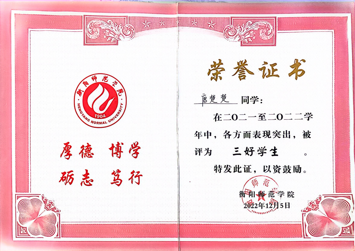 唐楚楚思想态度端正、锐意进取,热爱祖国与中国共产党,政治立场坚定。唐楚楚认为人生没有白走的路,每一步“笃行”都算数。她在大学期间认真学习了党的基本知识,并积极向党组织靠拢。在专业课的同时,唐楚楚也不忘努力提升自己其他方面的学习能力,考取了普通话二甲证书,英语四六级证书,教师资格证等,2021-2023年连续两年获“校一等奖学金”“校三好学生”荣誉奖励。与此同时,唐楚楚积极参与学科竞赛,在专业创新比赛方面有所成绩,于2023年荣获第九届全国大学生物理实验竞赛三等奖。