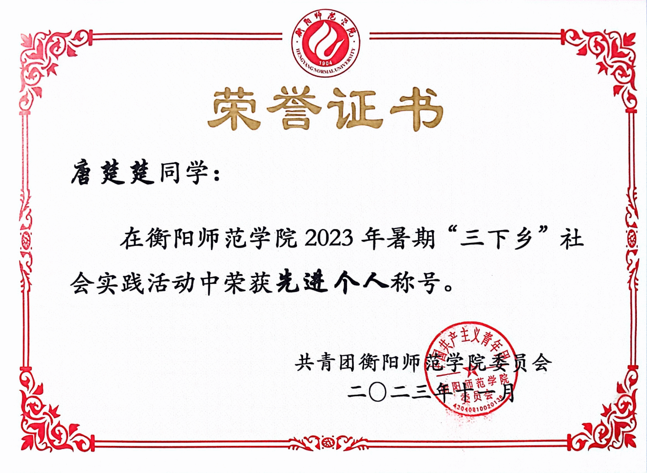 在2023暑假期间,唐楚楚在学校老师的带领下,加入了物理与电子工程学院“赓续雷锋精神,传承红色师范”雷锋家电红色志愿服务实践团,她深入到达衡阳市耒阳市新市镇开展“暑期三下乡”活动,开展了“义务维修家电”“趣味科学知识进乡村”“防溺水”等主题安全教育活动,唐楚楚还积极参加学校主办的“最美基层采访”,采访我院优秀毕业生基层就业情况。截至目前,唐楚楚已参加志愿活动40余次,个人累计志愿服务活动时长超过400小时。