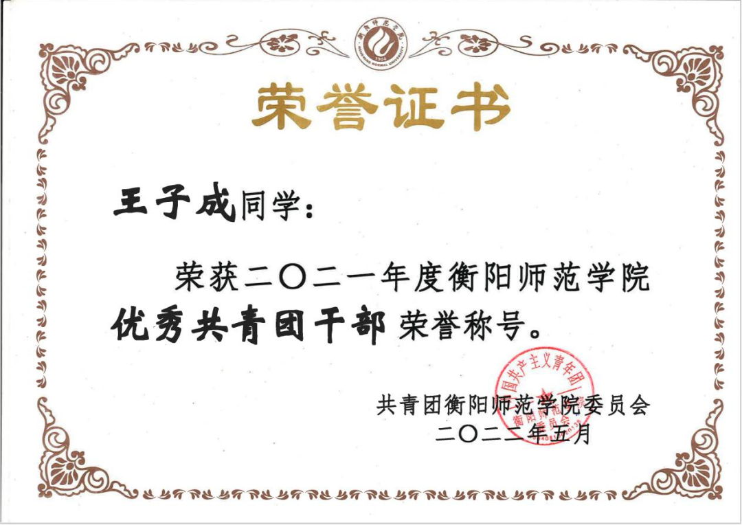 他在服务同学时不忘提升自己,以身作则。他为提升自我思想道德修养,参加了学校组织的青年马克思主义培训并顺利结业,同时积极参加每一次院内团日活动,并取得优异成绩:2021年“笔墨书丹青”地理与旅游学院书画比赛团日活动硬笔组三等奖、2021年地理与旅游学院心理健康操团日活动团体一等奖。