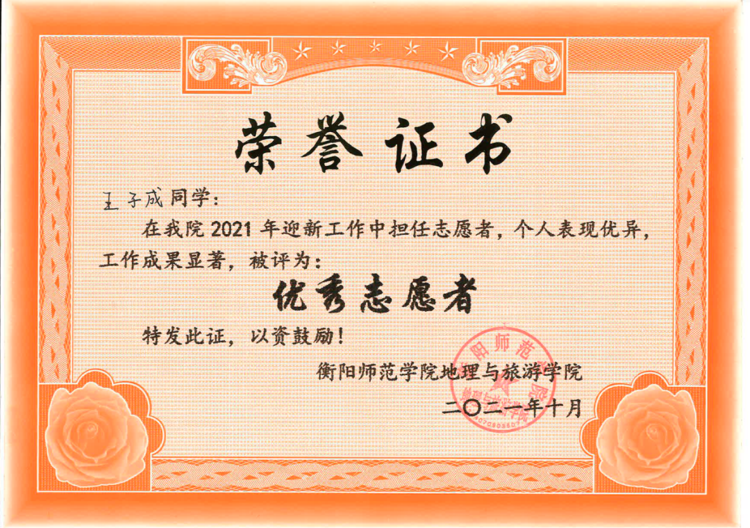 3.2021年402永利集团地理与旅游学院迎新工作“优秀志愿者”荣誉称号