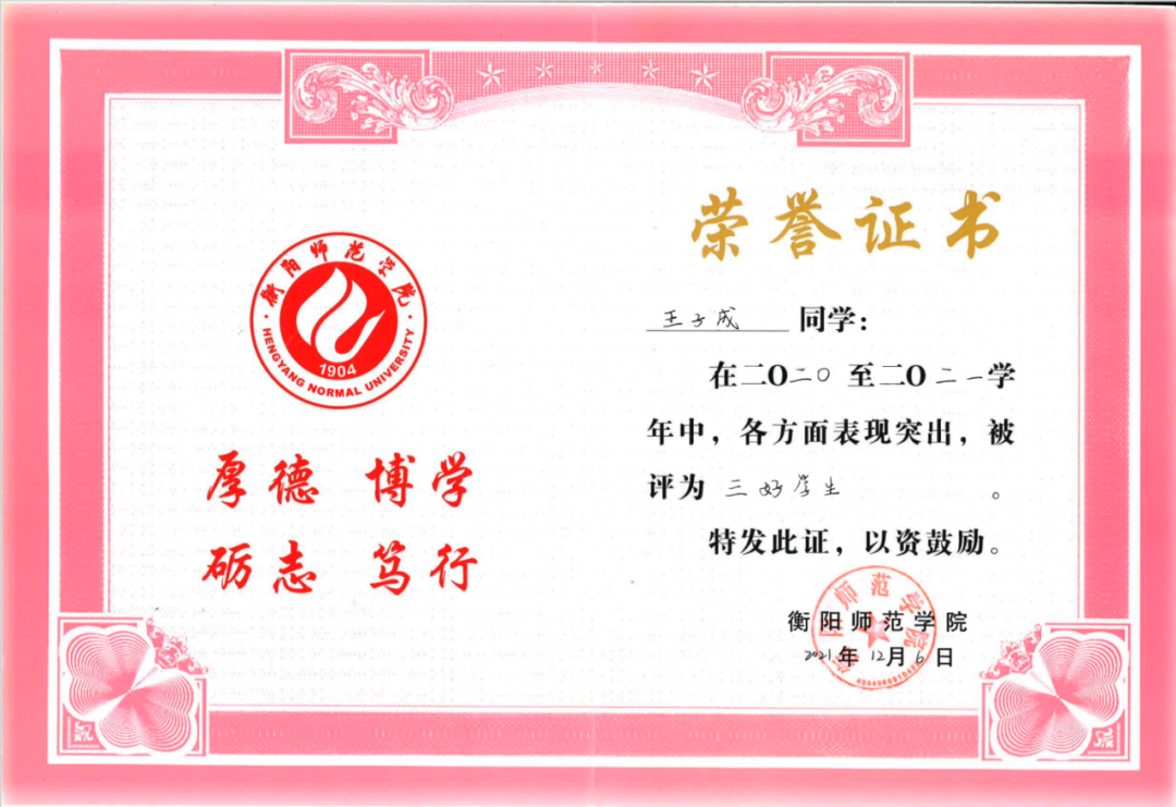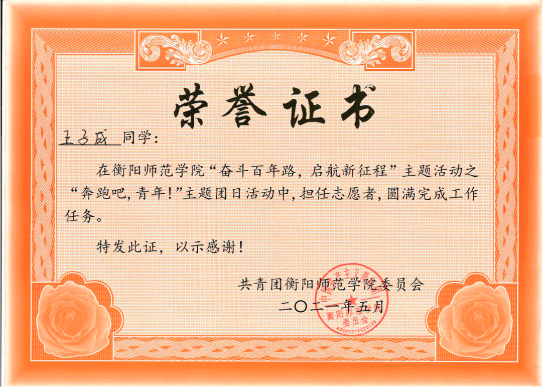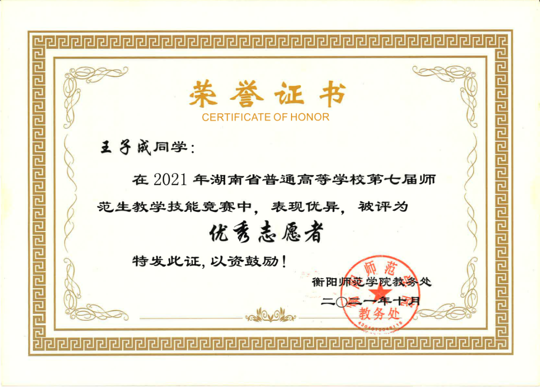 2.2021年湖南省普通高等学校第七届师范生技能竞赛“优秀志愿者”荣誉称号