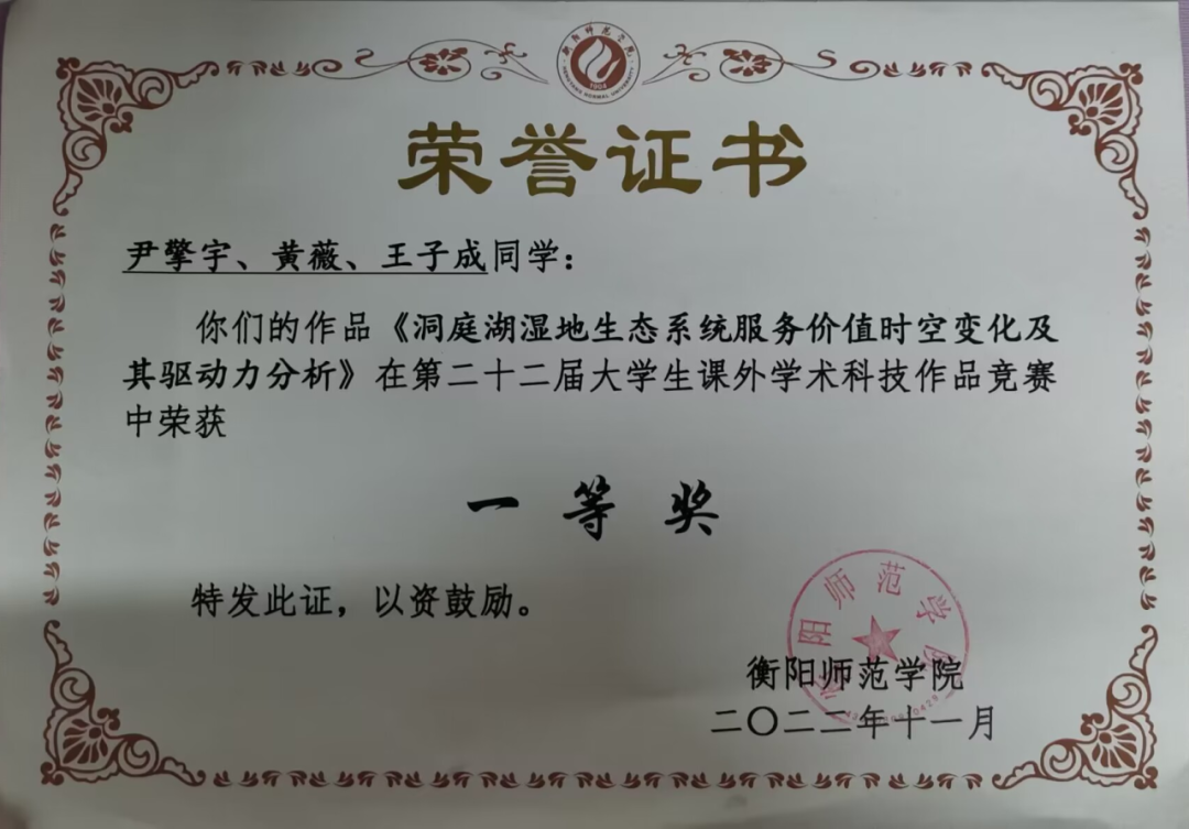 在全国“易智瑞”杯中国大学生GIS开发竞赛中,他积极寻找行业与社会利益相结合的突破口。将景观基因学术概念、GIS技术手段与传统聚落衰败的社会问题相关联,以所学知识解决社会痛点问题,主持开发出“村智书——传统聚落景观基因服务管理平台”,该作品获得应用开发组三等奖。在全国“航天宏图&华为云杯”PIE开发者大赛中,他将学科领域遥感数字图像处理技术和时空大数据分析方法相结合,创新出“基于PIE平台的多时相水稻提取方法”,凭借该作品,他获得了大赛遥感应用组优胜奖。另外,在自然地理学习时,他认识到洞庭湖的服务价值与湿地保护的重要性,与班级同学合作出“洞庭湖遥感生态服务价值估算”这一项目成果,获得该年份402永利集团2022年课外科技创新作品大赛一等奖。