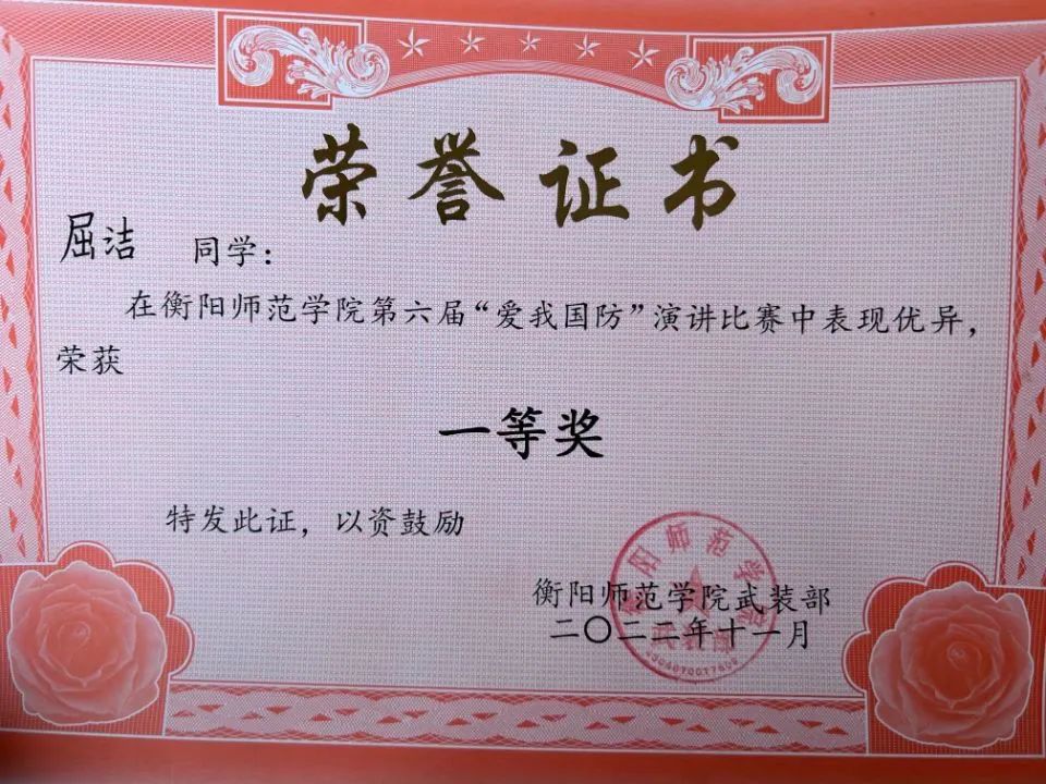 同年12月,屈洁代表学校去参加衡阳市的“爱我国防”演讲比赛,她丝毫不敢松懈,不断提高对自己的要求,不断优化演讲稿和动作上的细节,每一次说到那一句“她们身上穿的迷彩就是一份责任,身后就是祖国的领土,祖国就是她们的底气。只要她们在这里,谁也别想踏过她们的领海线!”,她的语气便忍不住变得慷慨激昂了起来,为自己是一名中国军人而感到骄傲,凭借她饱满的感情和感人的亲身经历,最终她的演讲在市里取得三等奖的好成绩。