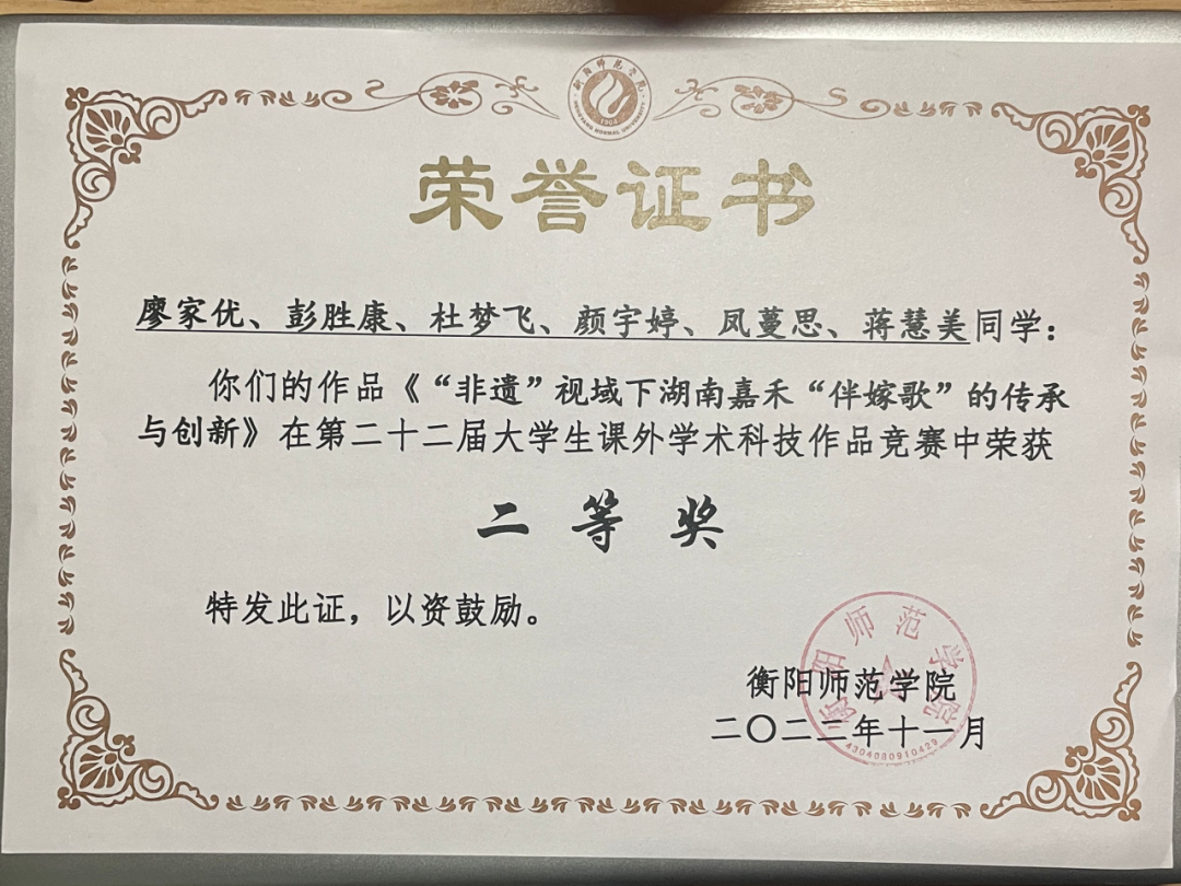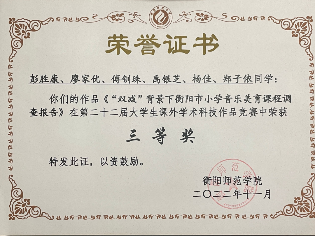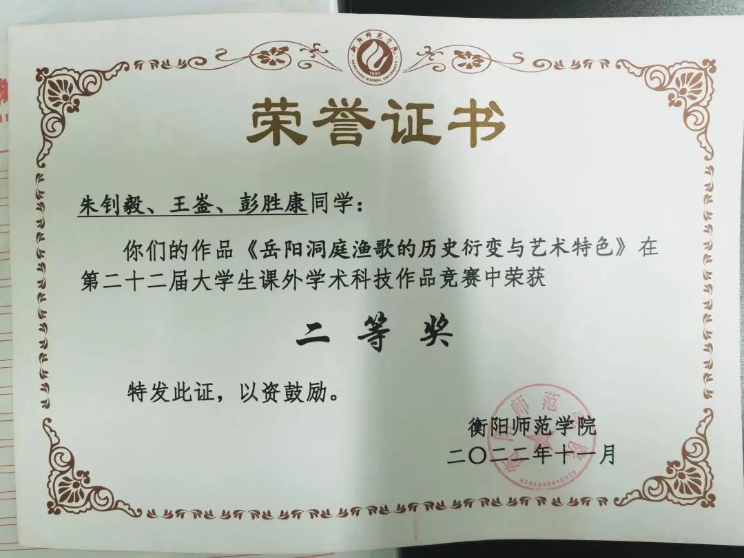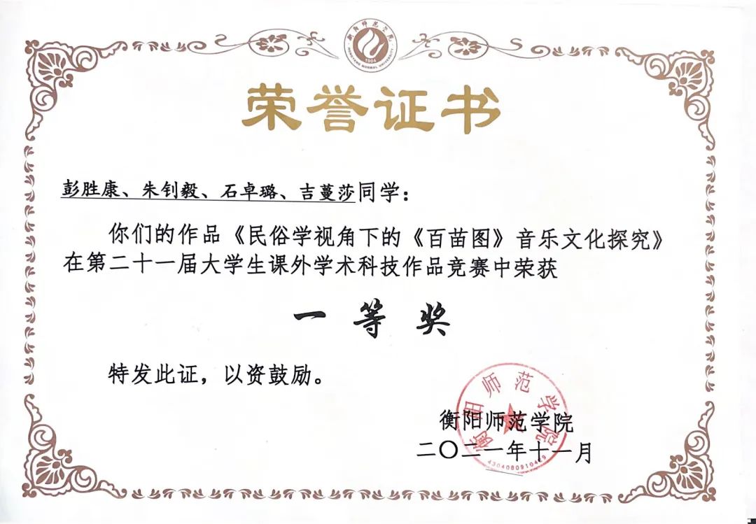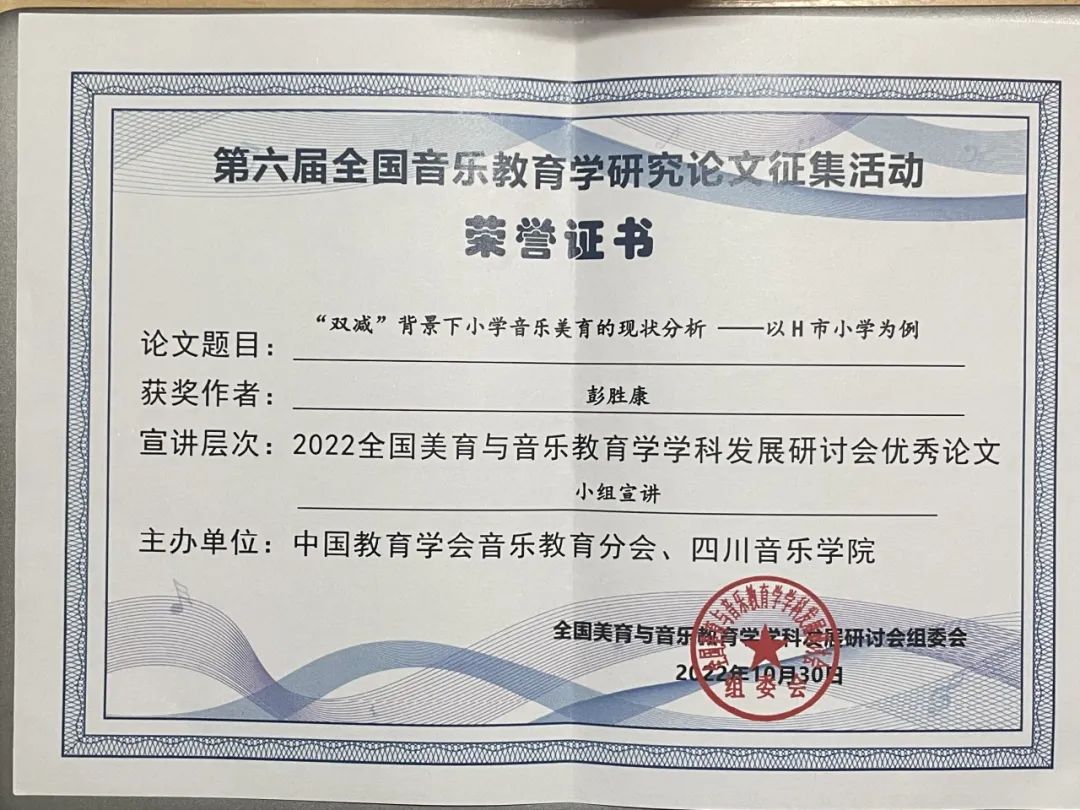 “一分耕耘,一分收获”,他认为不仅要学习理论知识,还要注重创新实践,学术科研。在大一他积极参加402永利集团大学生课外学术知识竞赛获得校级立项,他多方调研,阅读参考文献,终于《民俗学视角下“百苗图”的音乐文化探究》一论文获得科创校“一等奖”。在大二学年,他在陈瑾副教授的指导下,于七月份投稿“2022美育与音乐教育学学科发展研讨会”荣获第六届全国音乐教育学研究论文征集“优胜奖”,并有幸参与研讨会对自己的论文进行宣讲。
