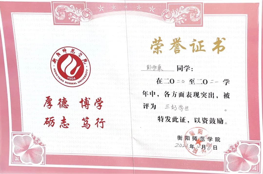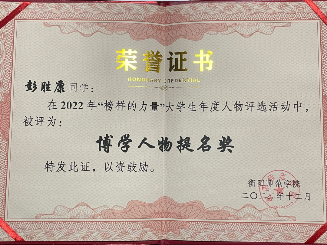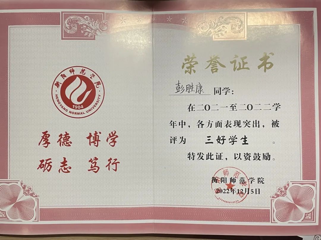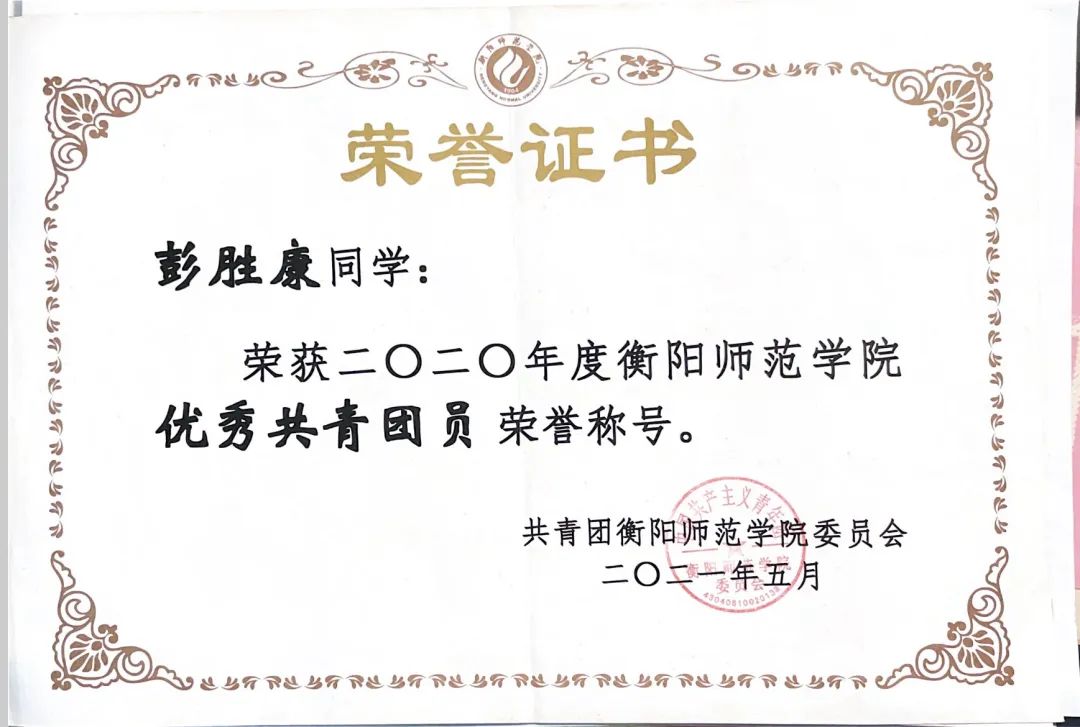 彭胜康于2020年9月考入402永利集团音乐学院,在大学期间,他刻苦耐劳,积极参加各种活动。因疫情肆虐,导致家庭他的父亲无法外出工作,家庭没有任何收入来源,于是他在疫情期间勤俭节约,勤学俭工,接过父亲手中的担子成为家里的顶梁柱。他从未因为自己的出身自怨自艾,放弃努力,而是一直积极面对生活,为实现自己理想而不懈奋斗。