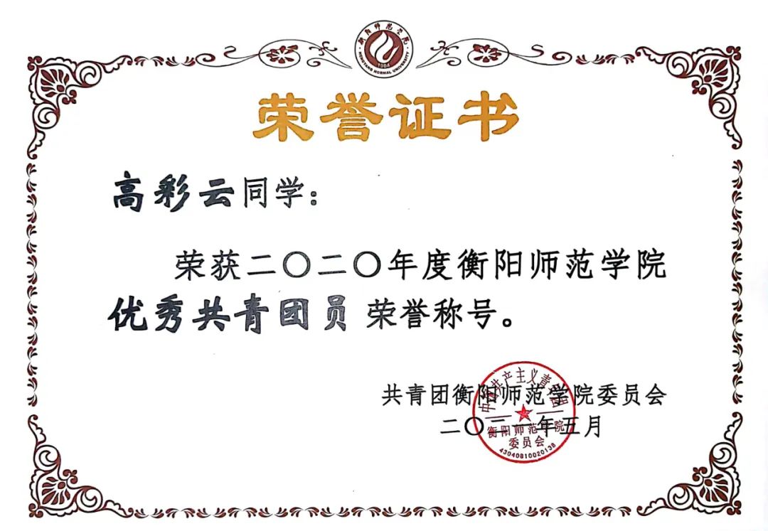 高彩云希望将这份温暖传递下去,故而她在学习工作之余还参加了20余次志愿服务活动,比如成为抗疫志愿者、卫生环保志愿者、村部政务志愿者等。2021年暑假,她的家乡张家界爆发了疫情,她主动向村委会申请参与疫情防控工作,协助村委会为村民们开展全面核酸检测。疫情防控期间,她的足迹遍布了村庄的每个角落,共计帮助父老乡亲500余人,志愿服务时长超300小时。她认为能够为村民们服务是一件十分开心的事情。她坚信,作为新时代的大学生,在国家的每个角落里发光发亮是人生的信念,听党话,跟党走,人生的路途便不会迷航。