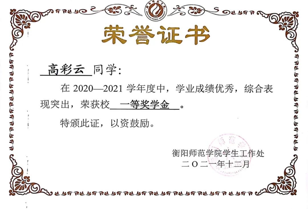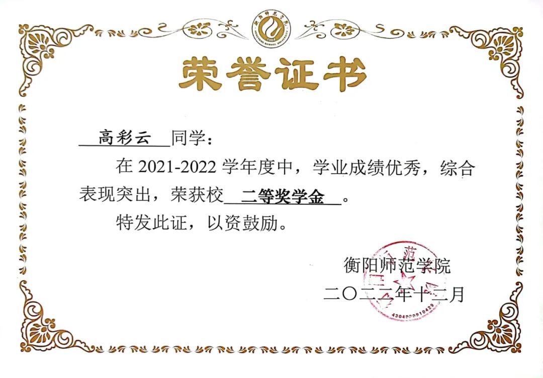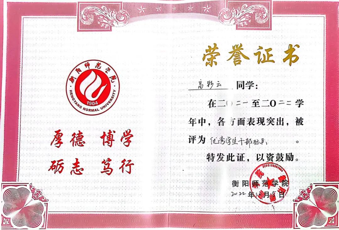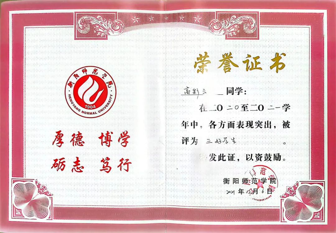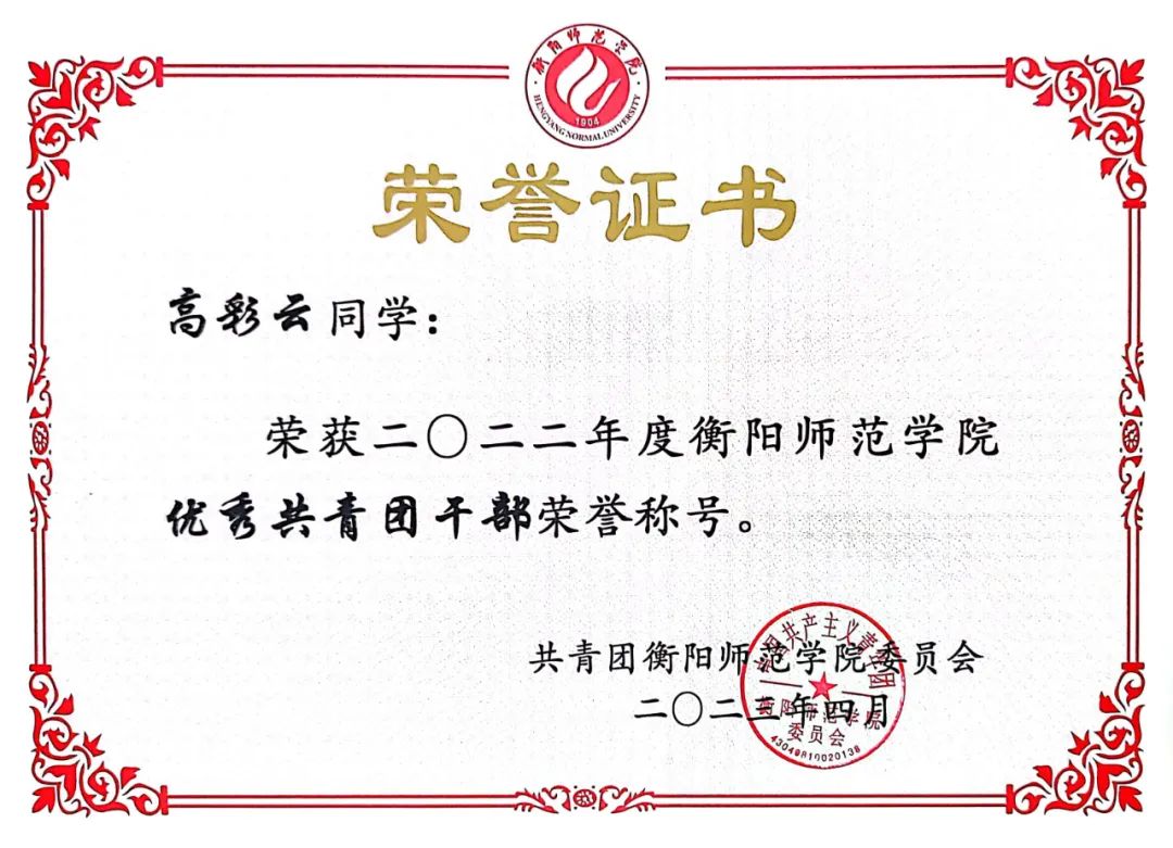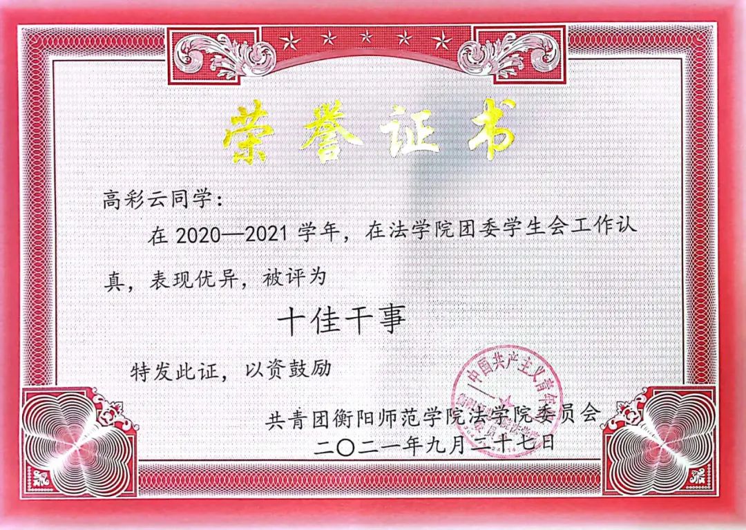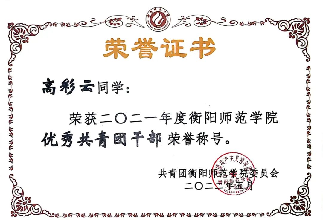 在工作上,她严格要求自己,勤恳认真负责,积极为老师和同学服务。获评了校2021年度校优秀共青团干部、2021—2022年度优秀学生干部标兵。
