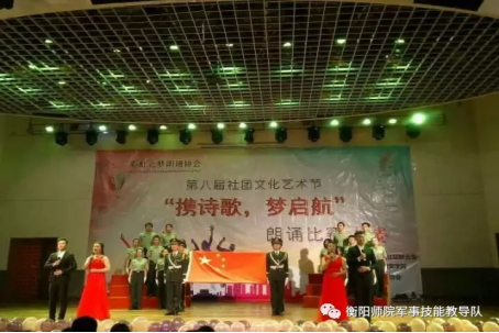 “能文能武,能歌善舞”,说的或许就是他们这一群人吧!他们不仅是光荣的学生军人,更是多才多艺的大学生。2016年12月11日,为丰富同学们的课余生活,传承中华民族传统文化,教导队全体成员参加了第八届社团文化艺术节“携诗歌,梦启航”朗诵比赛,一首《歌颂祖国》,他们用铿锵有力的声音,饱满昂扬的感情诉说着对祖国的热爱。整齐划一的军装、鲜艳的五星红旗、傲骨铮铮,展示着军人的风采,在此刻活动中,他们也取得了第一名的好成绩。