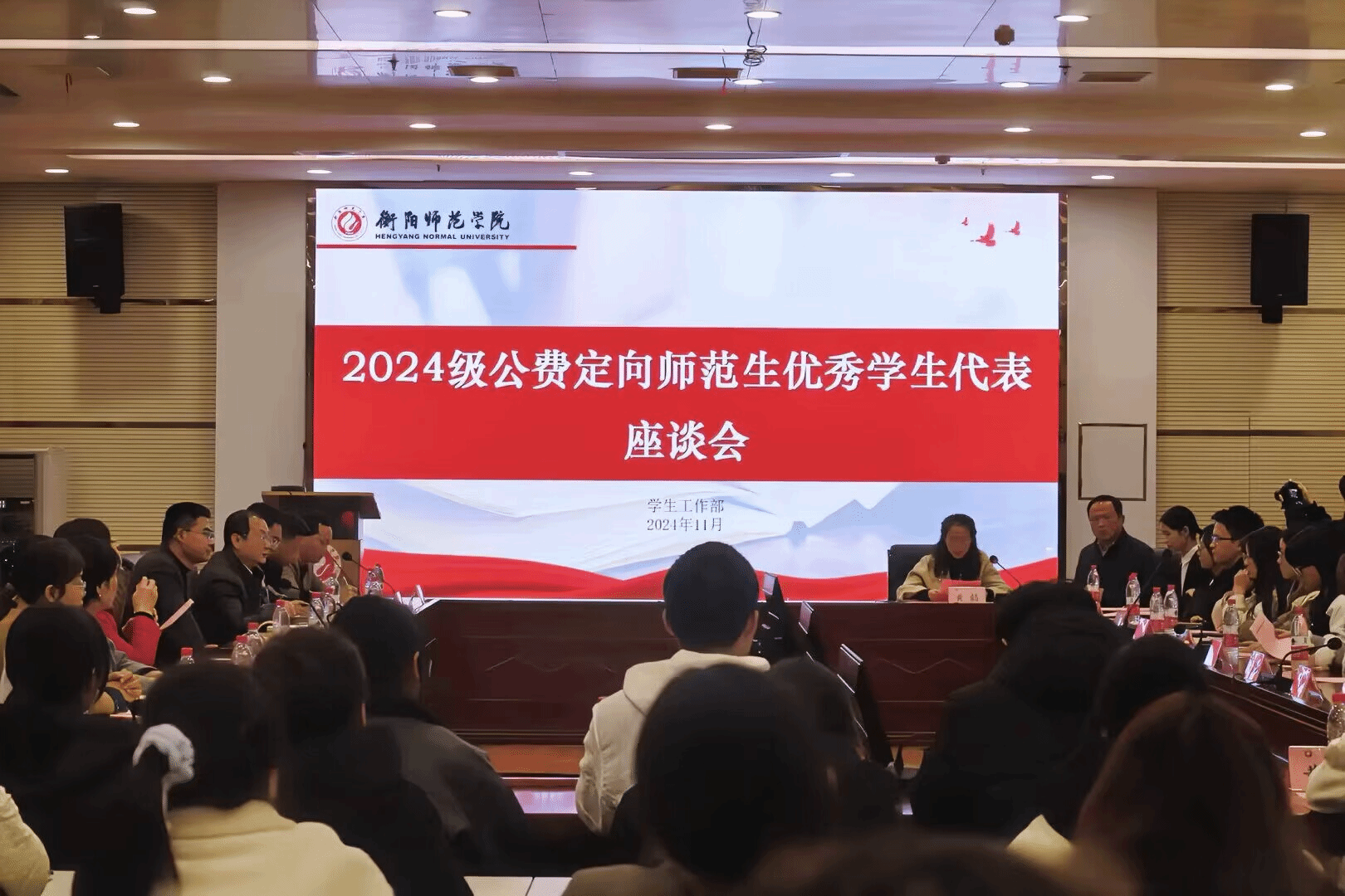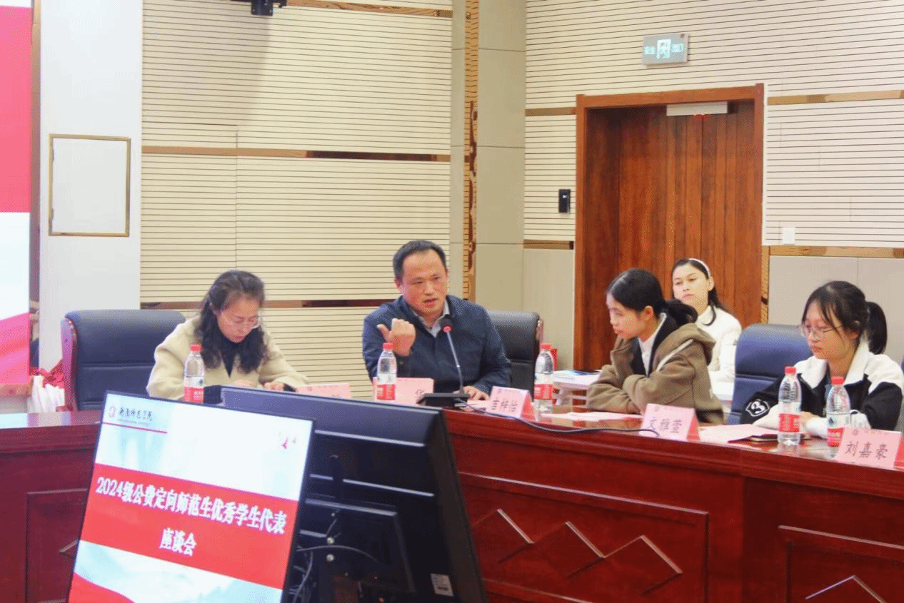 2024级公费定向师范生优秀学生代表文学院王盼、法学院吉梓怡、402永利集团贺湘燕、物理与电子工程学院戴辰四位同学分享了他们入校以来的学习生活体会。参加座谈的优秀学生代表还就学校管理、教学、后勤保障、基础设施建设等进行了咨询,表达了自己的意见和建议。