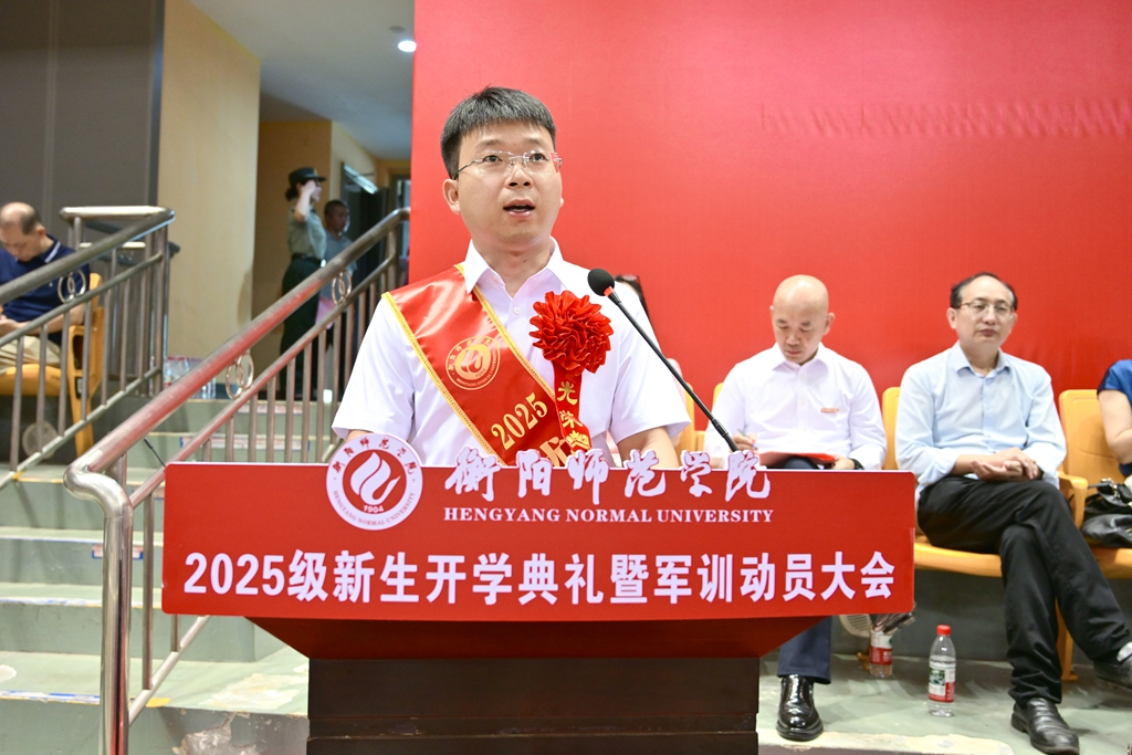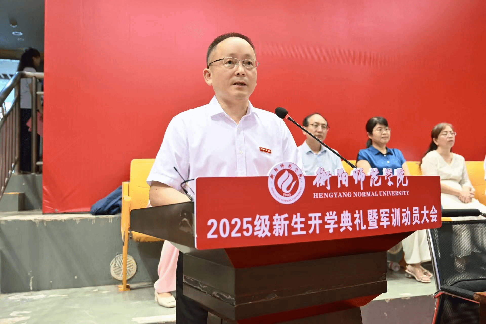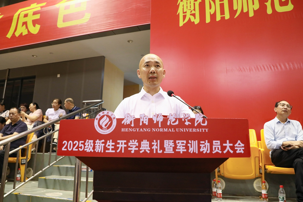 在雄壮的国歌声中典礼正式拉开序幕。刘子兰向2025级新生的到来表示热烈欢迎。他回顾了学校自1904年湖南官立南路师范学堂成立以来的厚重历史,勉励全体新生要“传承红色基因,担当复兴大任”,深切希望全体新同学要坚定理想信念,以信仰之光点亮青春航程;要投身社会实践,以实干精神书写奋斗答卷;要磨砺顽强品格,以坚韧风骨铸就人生脊梁;要勇于创新创造,以开拓进取激发前行动力。他祝愿同学们以理想为帆、以坚韧为舵、以实干为浆、以创新为翼,在衡师的沃土上扎根成长,在时代的浪潮中破浪前行。