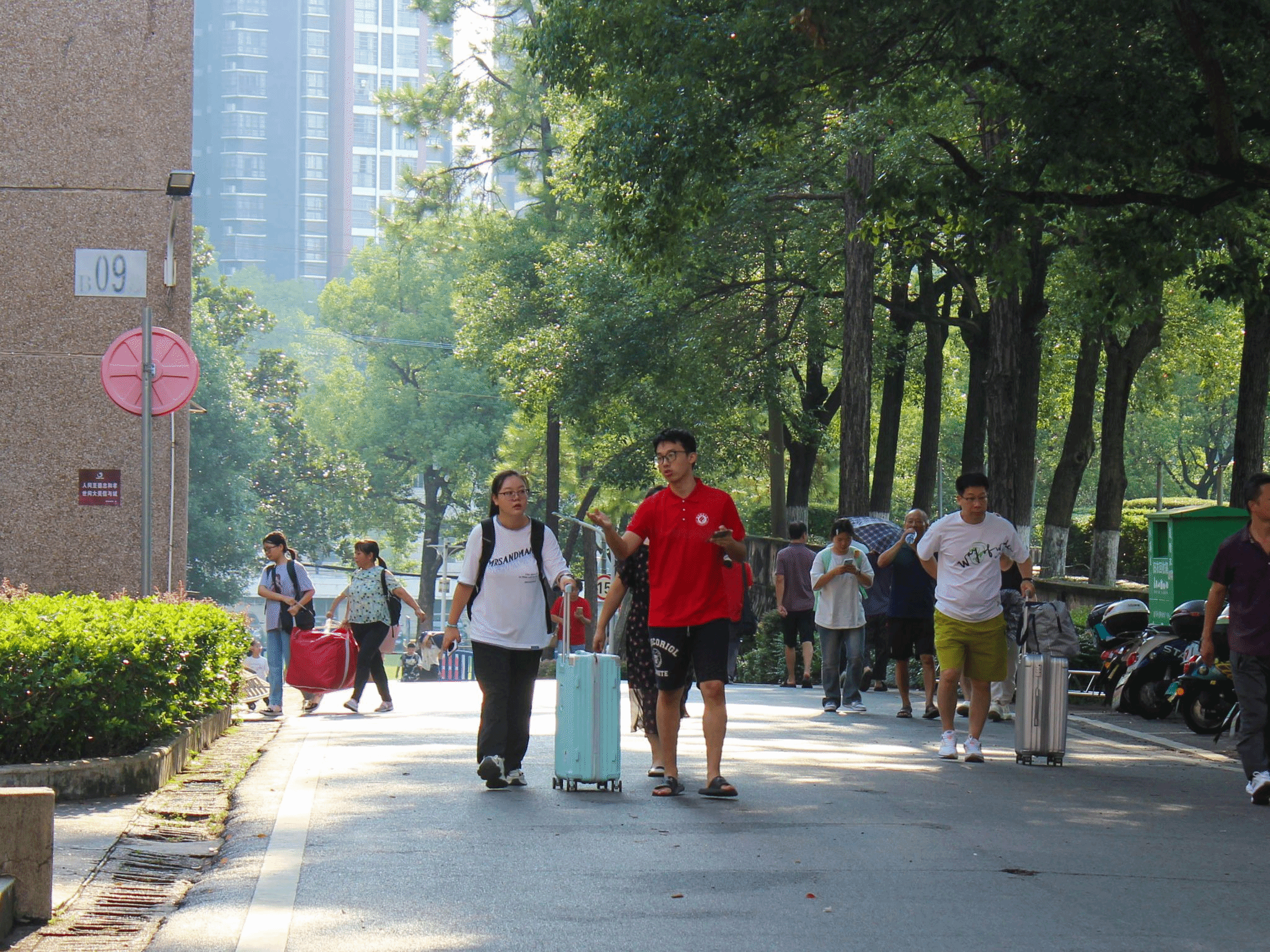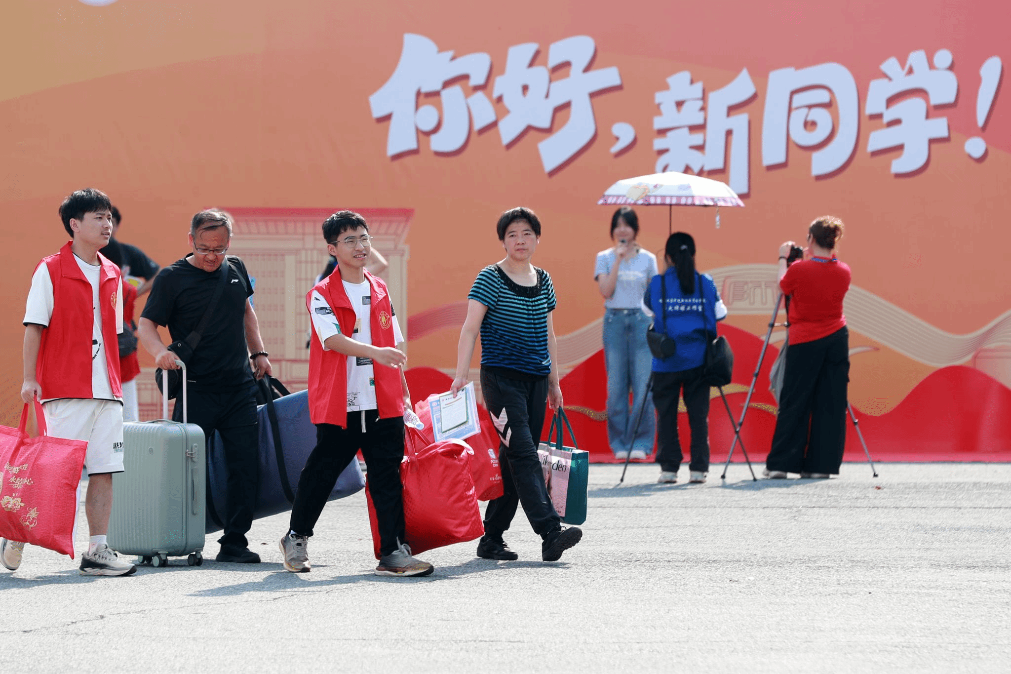为保障迎新工作高效有序,新生报到环节精简为“志愿者引导—填写资料领取物品—扫码验证—人脸识别”一站式服务。校园设置清晰标识,新生可快速完成注册,有序入住。校园内一面面“欢迎,新同学!”的旗帜迎风招展,人潮涌动间满是热闹气息。学生志愿者们热情引导、搬运行李、介绍校园,保证新生可以快速了解校园环境与设施;家长休息区内饮用水、应急药品等物资齐备,温馨周到的服务获得新生及家长一致好评。