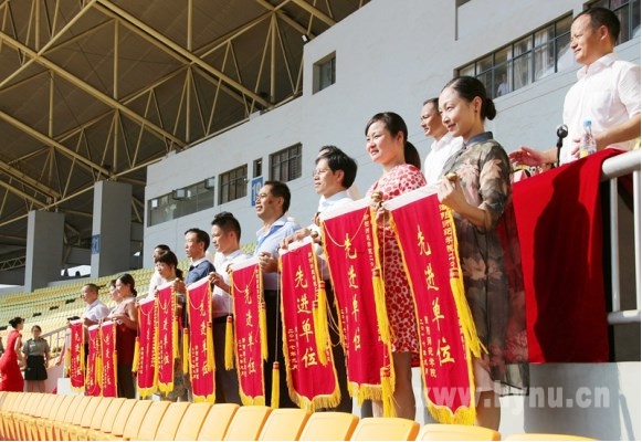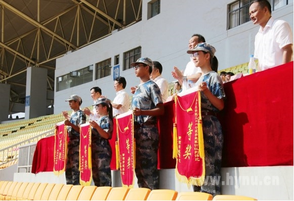 党委副书记刘福江宣读2017级学生军训内务、队列评比表彰决定。在场的校领导为10个内务评比先进单位、20个队列评比获奖集体颁奖。其中,法学院等10个学院荣获内务评比先进单位称号,体育科学学院10营1连等4个方阵队荣获队列评比一等奖,生命科学与环境学院16营2连等6个方阵队荣获队列评比二等奖,数学与统计学院11营3连等10个方阵队荣获队列评比三等奖。