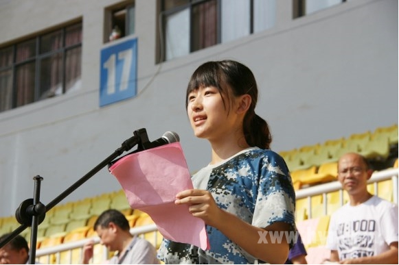 文学院2017级学生常希芷代表新生发言。她说,回首刚刚过去的军训时光,经历了哭与笑,苦与累,也收获了坚强的意志和美好的回忆。展望即将开始的大学生活,她代表所有新生表示,将会谨记军训精神,铸刚毅之魂,强健康之魄,濯沧浪之德,向着生命中每一座山峰,勇敢攀登。
