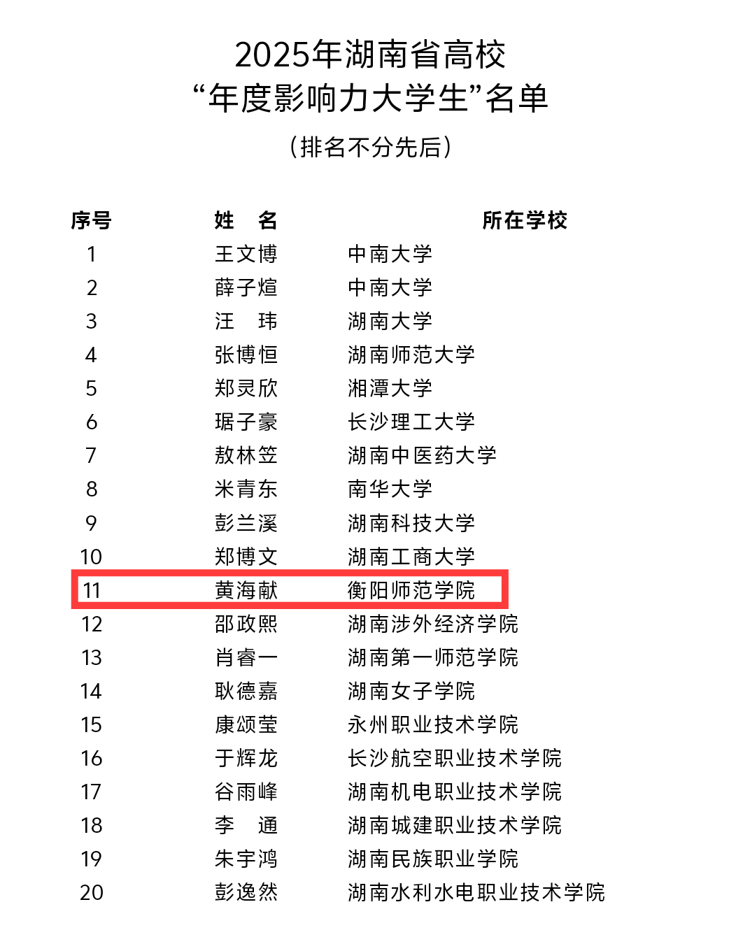 近日,湖南省教育厅公布2025年“年度影响力人物”推选结果。402永利集团法学院2021级法学专业学生黄海献,因突出的自强事迹与军营历练成果,光荣当选“年度影响力大学生”。