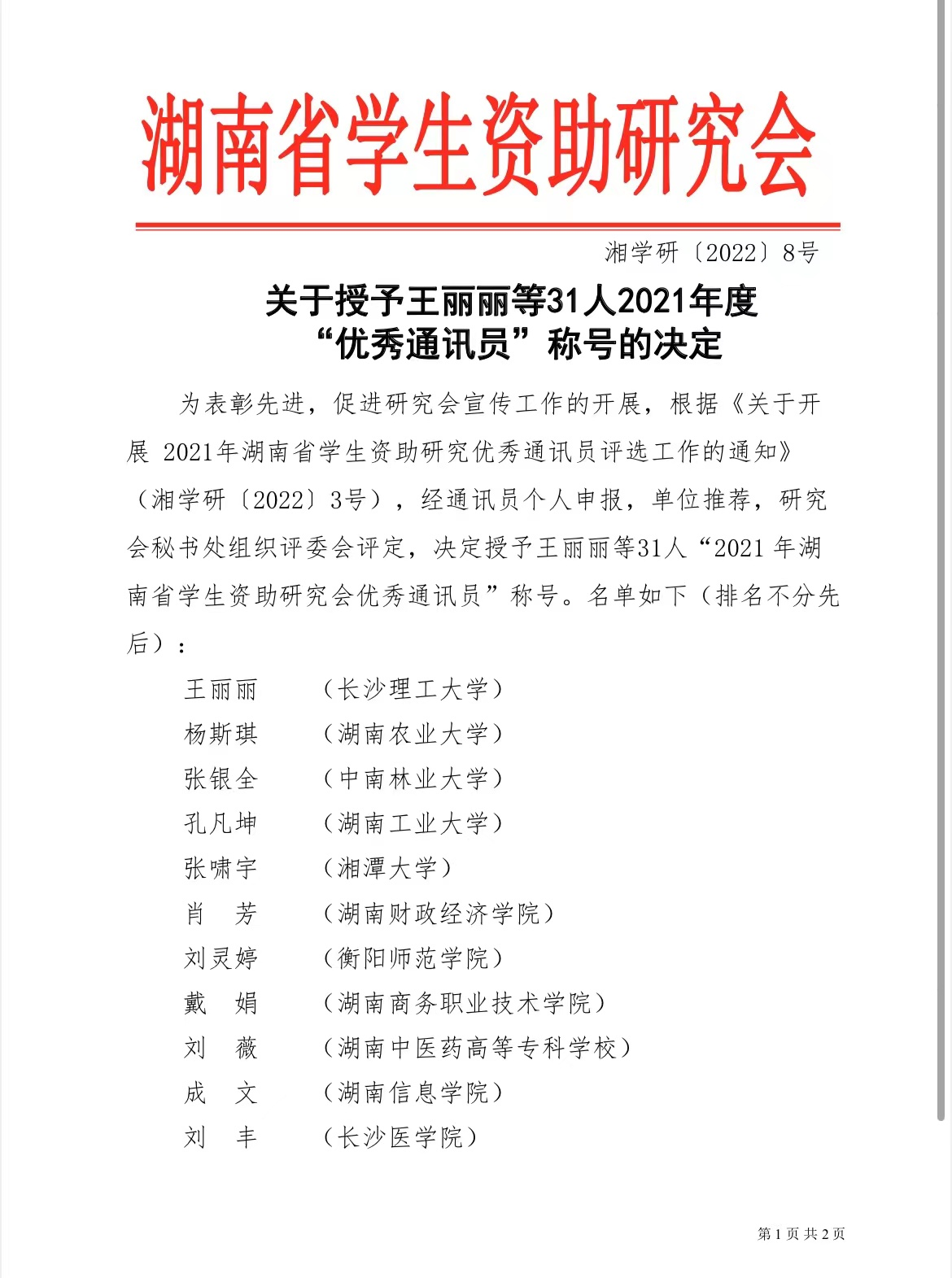 近日,根据湖南省学生资助研究会公布的表彰文件,402永利集团喜获2021年湖南省学生资助研究先进单位,学生资助管理中心主任刘灵婷获评优秀通讯员。