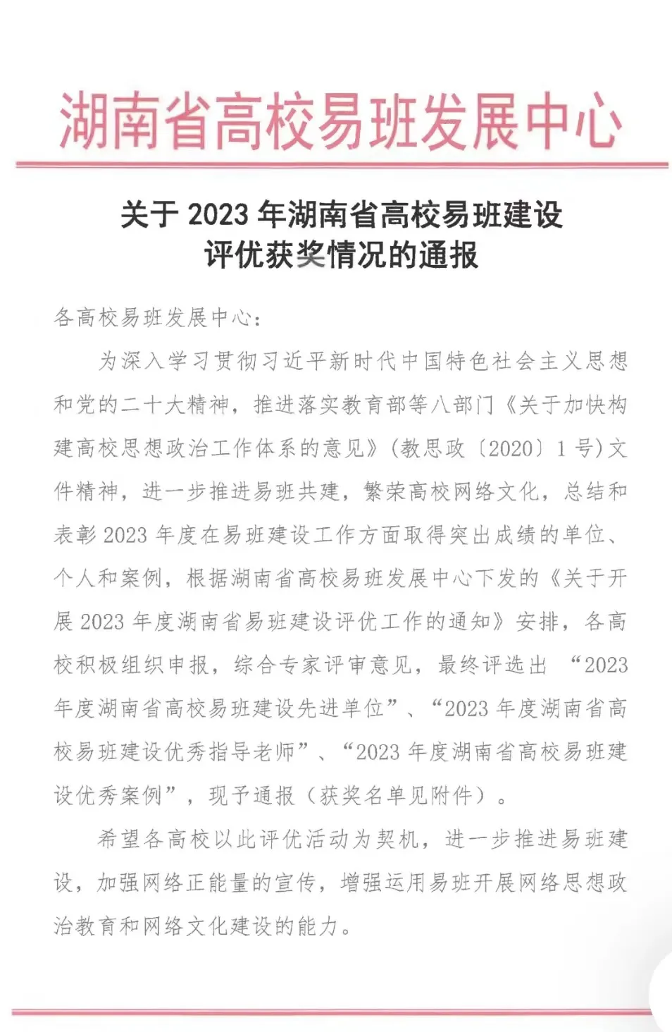 持续深化调研、课程、活动、文化“四个融合”。举行学生座谈会、开展网络问卷调查形成相关调研报告,定期召开全覆盖式的主题班会近1000场次,常态进行有针对性的谈心谈话,及时、全面了解和掌握学生所思所想和所念所盼;全覆盖、立体化精准开展“双学双承”“礼敬中华优秀传统文化”“为时代育新人”等系列教育引导活动;组织开展涵盖7项内容、涉及10种形式的“青春践行二十大 奋楫笃行再出发”毕业生主题教育和“一年级基石计划”新生入学教育。持续开展“榜样的力量”大学生年度人物评选活动,打造更具代表性、多样性、亲和力的“身边的榜样”;坚持抓好典礼育人,继续办好毕业典礼、开学典礼、“榜样的力量”年度人物表彰,充分发挥榜样引领作用。今年,402永利集团涌现出了“中国大学生自强之星”奖学金、湖南省“最美大学生”获得者等一批先进典型。