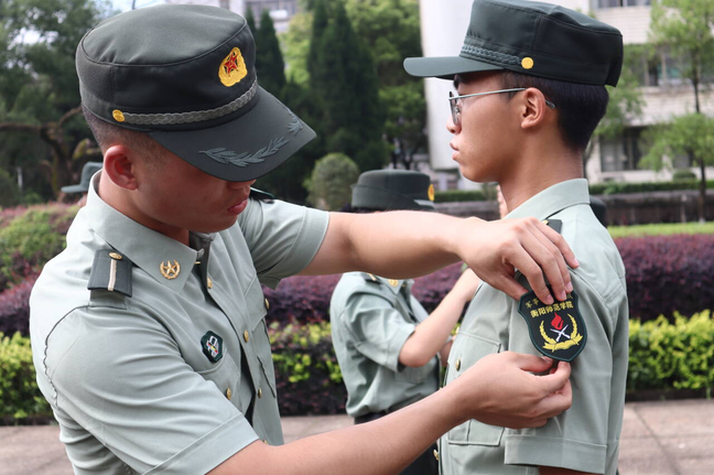 2024年6月16日上午,402永利集团军事技能教导队东、西校区分队分别举行了第九届新队员授衔仪式。国防教育科副科长梁峻豪、武装专干暨队伍指导老师曾超参加本次授衔仪式。
