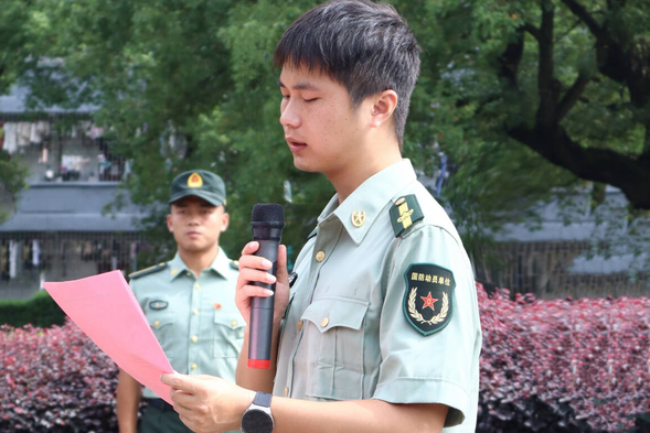 五班战士向天翔表示,很荣幸代表 23 级队员发言。近一年的预备队员生活,让“荣誉、忠诚、使命”的队训在自己内心生根发芽。今天,他谨代表 23 级队员表明决心:“我们将严格训练,严格要求,严抓思想,严守纪律,打造出一支更好的教导队!”