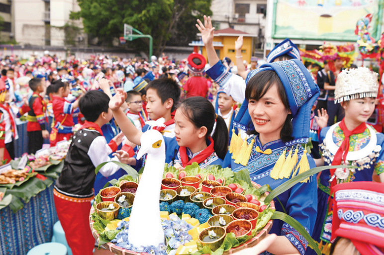2023年4月20日,广西南宁市逸夫小学举行2023“壮族三月三”暨“铸牢中华民族共同体意识”主题教育活动。色彩缤纷的民族服装、民族风情浓郁的歌舞表演、多种多样的特色美食,让校园处处洋溢着欢乐。