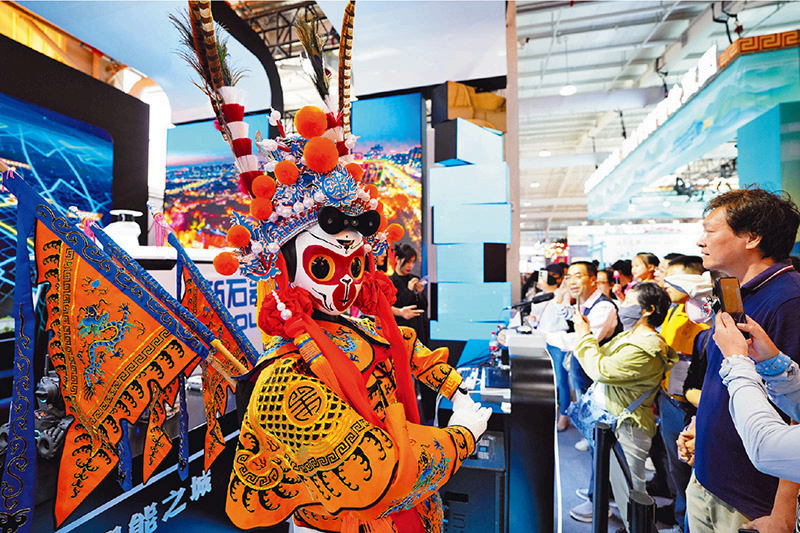 弘扬中华优秀传统文化,要处理好继承和发展的关系,重点做好创造性转化和创新性发展。图为2024年9月15日,在服贸会首钢园区的文旅服务专题展区,孙悟空形象的仿生机器人吸引参观者。