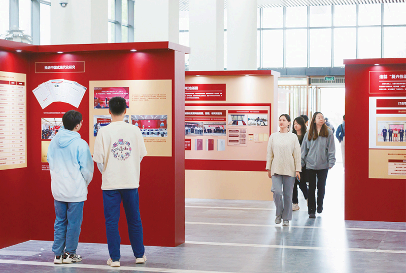 2023年4月25日,中国人民大学推出“习近平总书记考察调研中国人民大学一周年 走出一条建设中国特色世界一流大学新路”主题展。图为学生参观展览。
