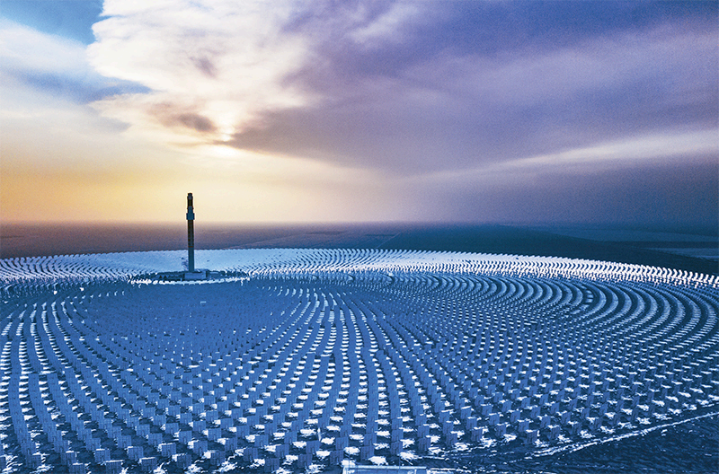 图为2024年2月26日 ,在茫茫雪地里持续吸光发热的首航敦煌100兆瓦熔盐塔式光热发电站。 人民图片 王斌银/摄
