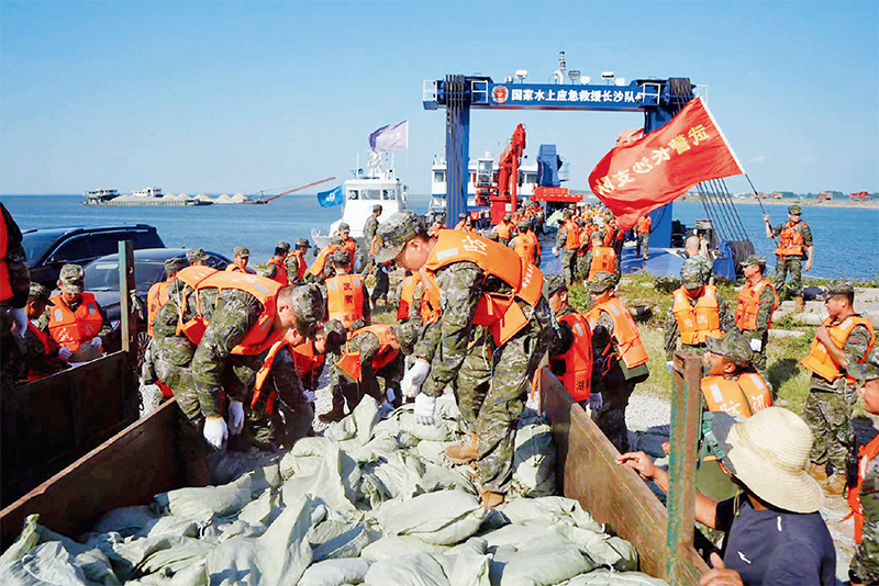 万众一心、众志成城 ,集中力量办大事的制度优势在应对风险挑战中充分彰显。 图为2024年7月6日 ,武警湖南总队官兵在湖南省岳阳市华容县团洲垸受灾现场第二道防线搬运沙袋加固堤坝。 新华社发 张森/摄